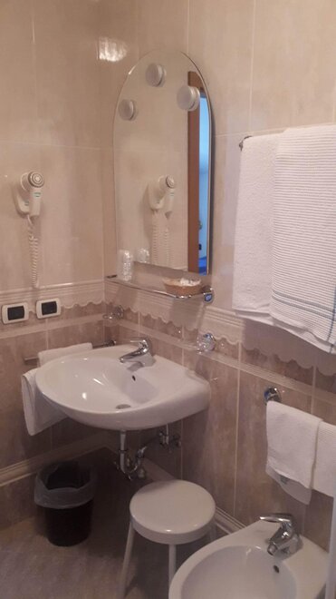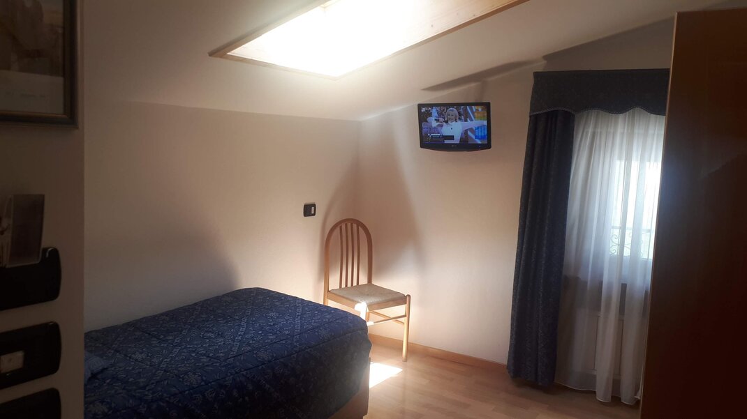 Standard single room with: shower, toilet, TV, safe, hairdryer.