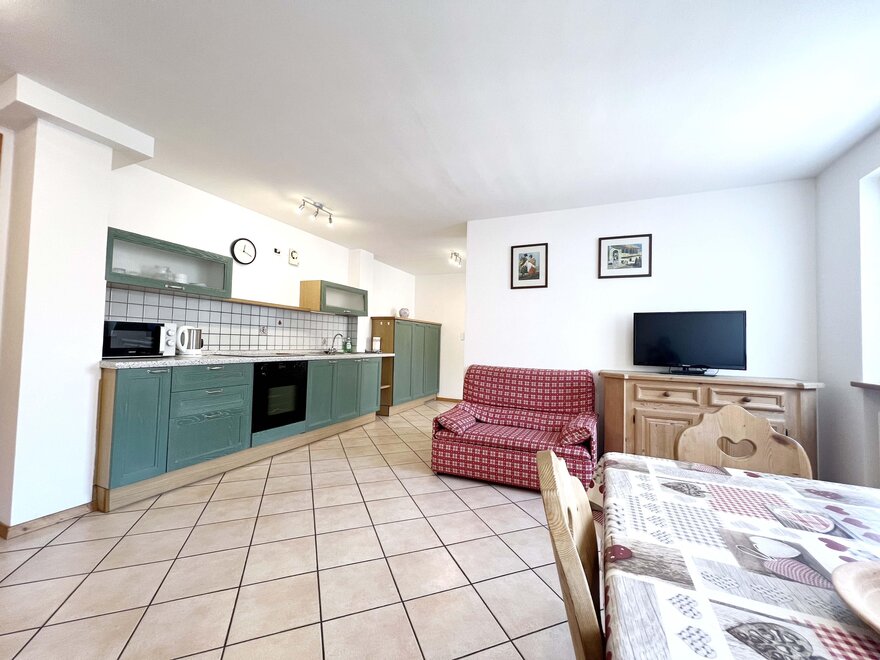 no carpet, living-room with kitchenette, closet, heater, apartment without fitted carpet, living room, cooking possibilities, seasonal rental too (winter), dishes available, Midweek cleaning only on request - for a fee, Wi-fi free of charge, microwave, dishwasher, kettle, hairdryer, WiFi, iron, seasonal rental too (summer), family room/apt., feather beds, refrigerator, electric stove, balcony, kitchen, central heating, bedding, washing machine, self check in, TV, internet connection available, kitchenette