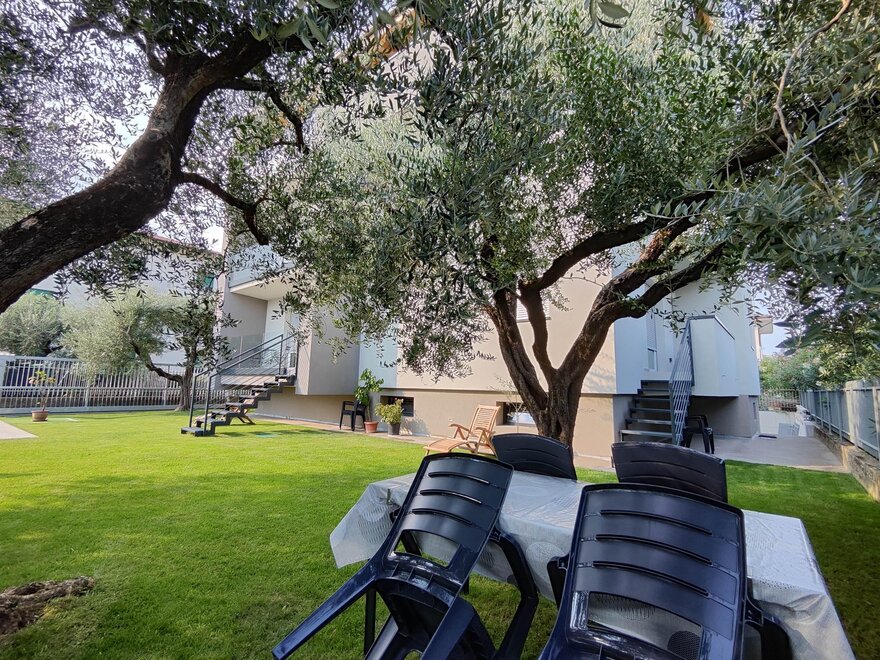The apartment offers 1 bedroom with double bed and wardrobe, 1 bedroom with 2 single beds and wardrobe. Living area with full kitchen, satellite TV and streaming, double sofa bed and balcony with access to the shared garden equipped with table, chairs and deckchairs. Complete bathroom with sink, bidet, toilet, shower, washing machine and balcony.