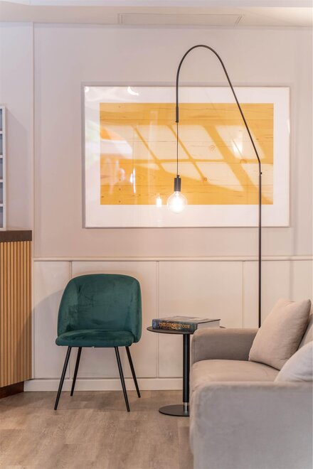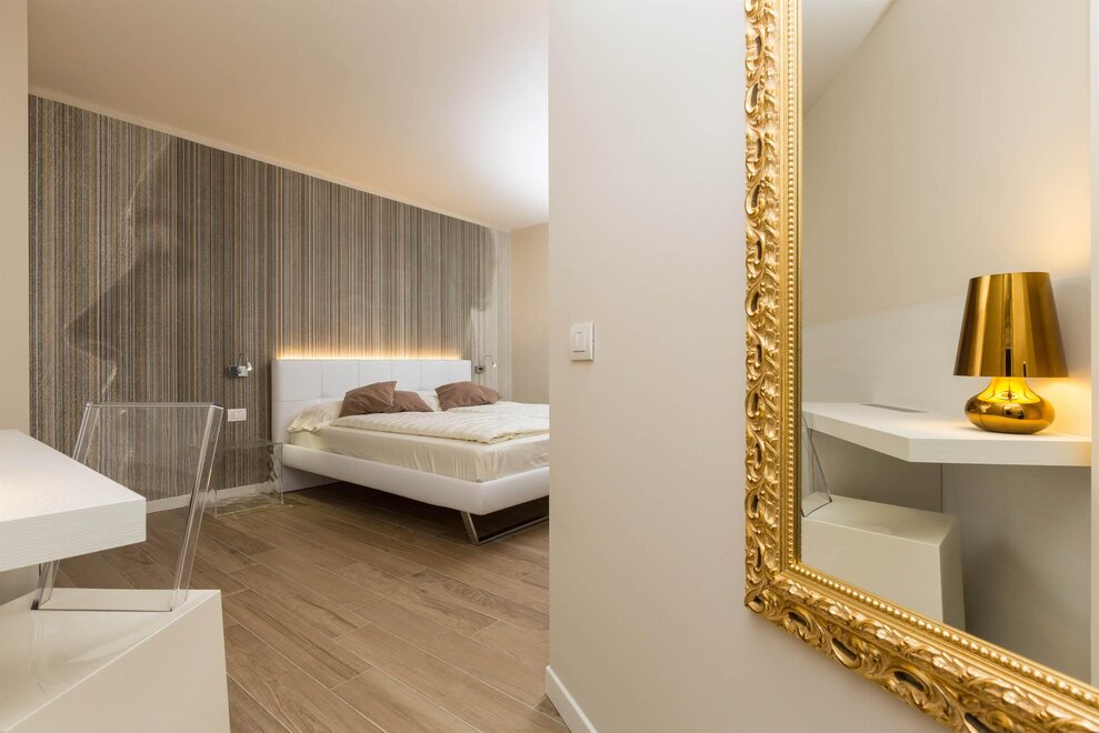 Junior Suite 35 sqm composed by rooms with king size bed, bathroom with shower, living with sofa.