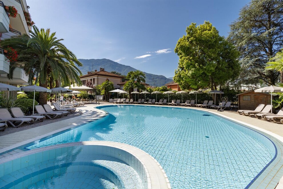 A holiday on Garda Lake becomes an experience of emotions and well-being in our four star Hotel. The comfort of the rooms, the availability of our staff and the many quality services combined with attention of the detail that characterize our structure will make you feel really special. The Palace Hotel Città , in the center of Arco, not far from the fascinating castle, charming alleys and all the attractions of the city, is a four star elegantly furnished which combines together the elegance ,familiarity , comfort and refinement, to satisfy all the guests and make your holiday on Garda Lake, a memorable one. In our hotel you will find also a special lounge with a wellness spa , a large garden with an outdoor swimming pool , whirlpool and a restaurant where you can taste the most typical delicious recipes, to fully enjoy the pleasure of a relaxing vacation on the lake. Centrally located at about 300 mt. from historical centre. Lounge area, Bar, Restaurant, 2 elevators, gar