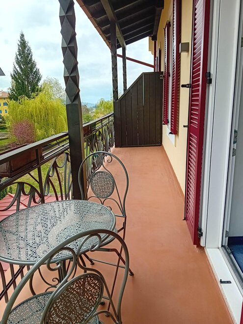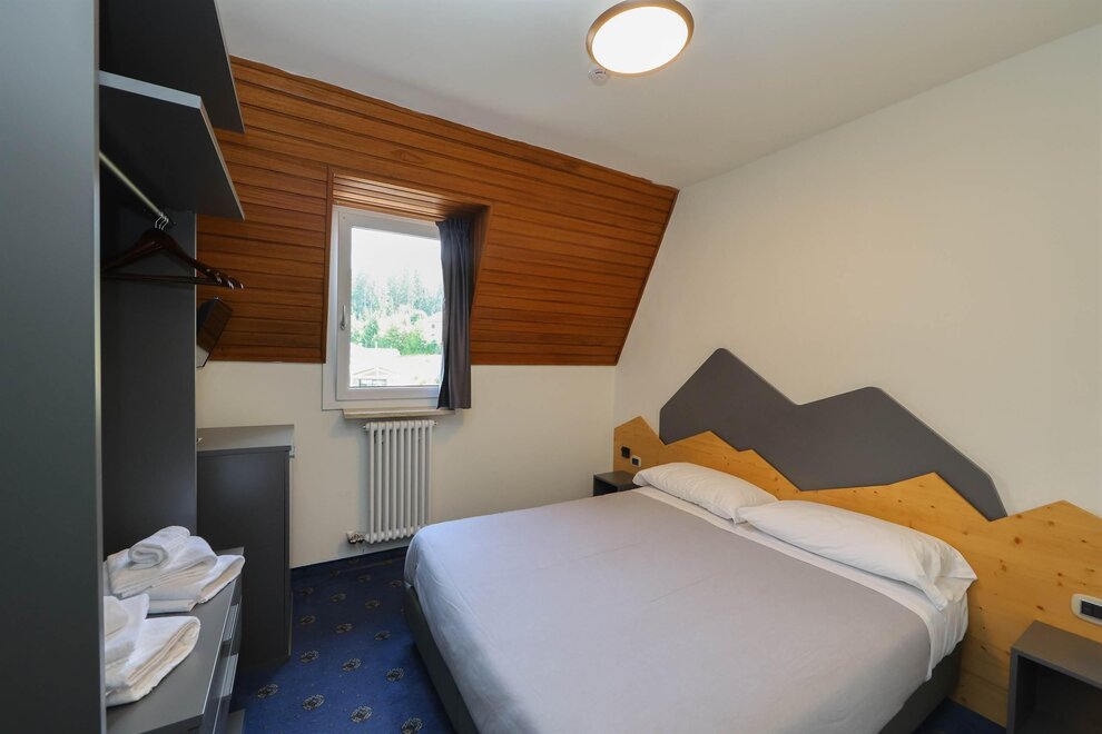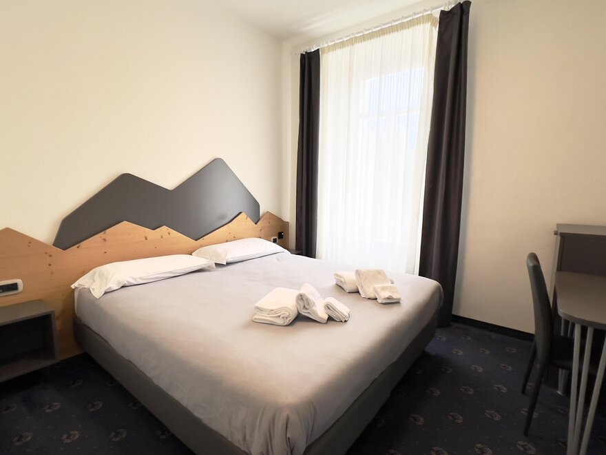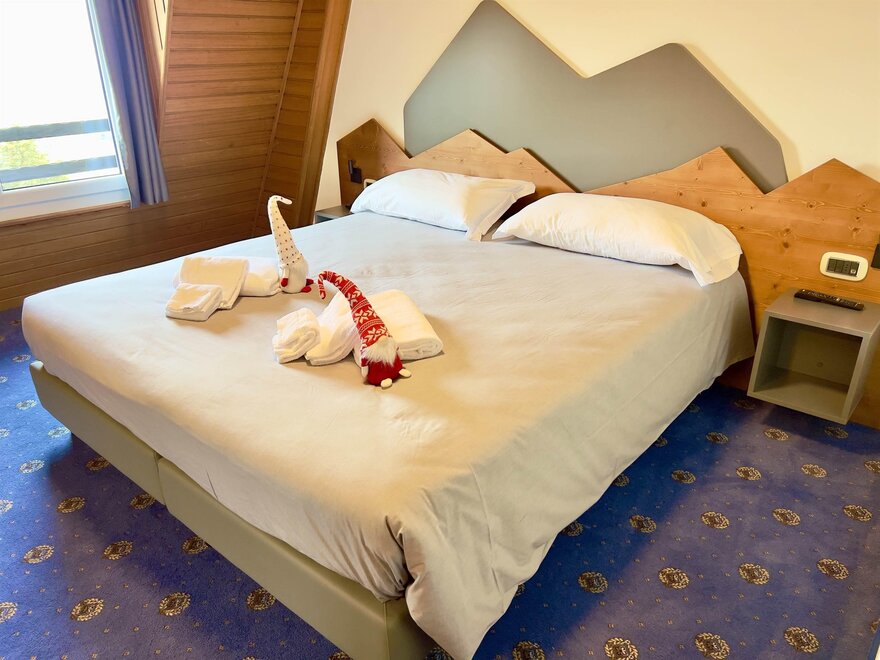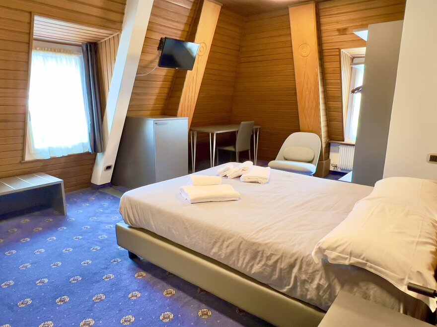 The Mini Suites: located on the fourth floor, offer an exclusive and intimate experience, with the charm of the wooden attic and exposed beams creating a warm and refined atmosphere. From the large windows, guests can enjoy a breathtaking view that opens onto the valley, making every moment even more special. The rooms, spacious and cozy, are furnished with a double bed, a desk, and a relaxation corner with an armchair, perfect for enjoying moments of tranquility. Each mini suite is equipped with a refrigerator, safe, and a desk, offering the utmost comfort and functionality. A perfect retreat for a couple's evening dedicated to privacy and relaxation.