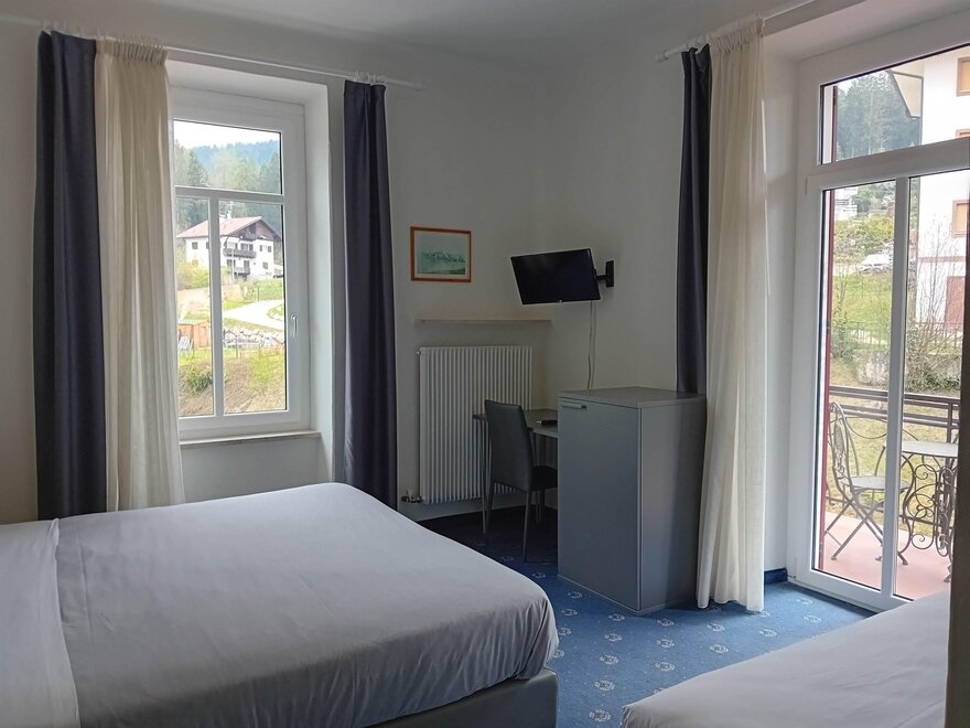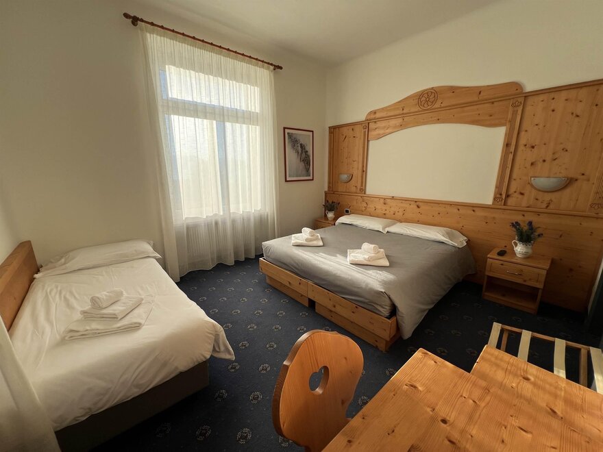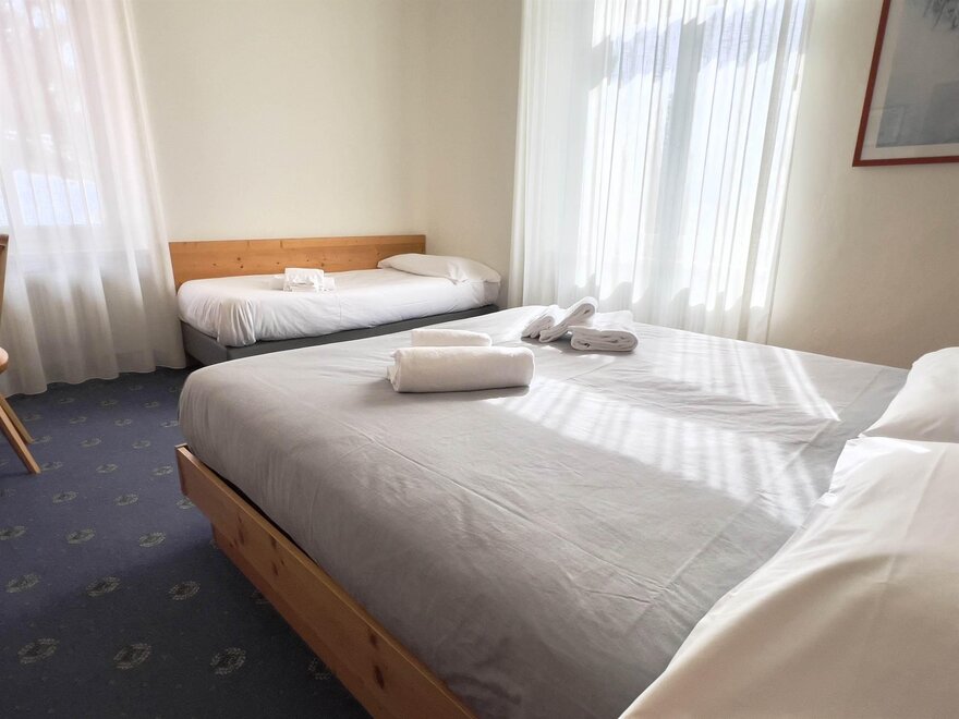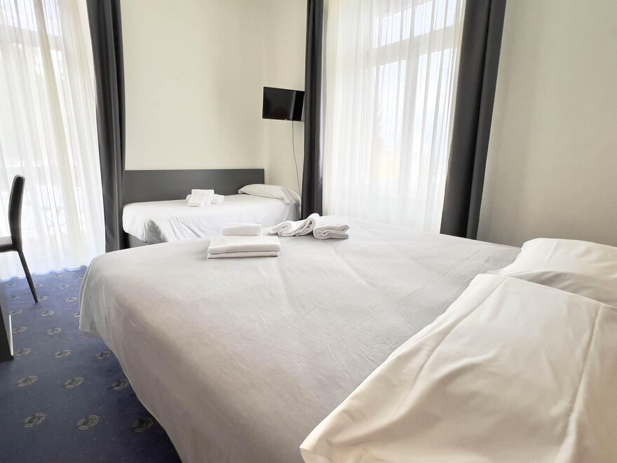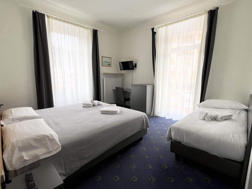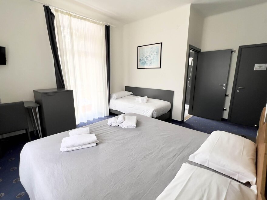 The triple rooms (qty 3) 22 sqm. are ideal for accommodating up to 3 people. Each room is equipped with a double bed and a single bed, as well as a desk, TV, and fridge to meet every need during the stay.