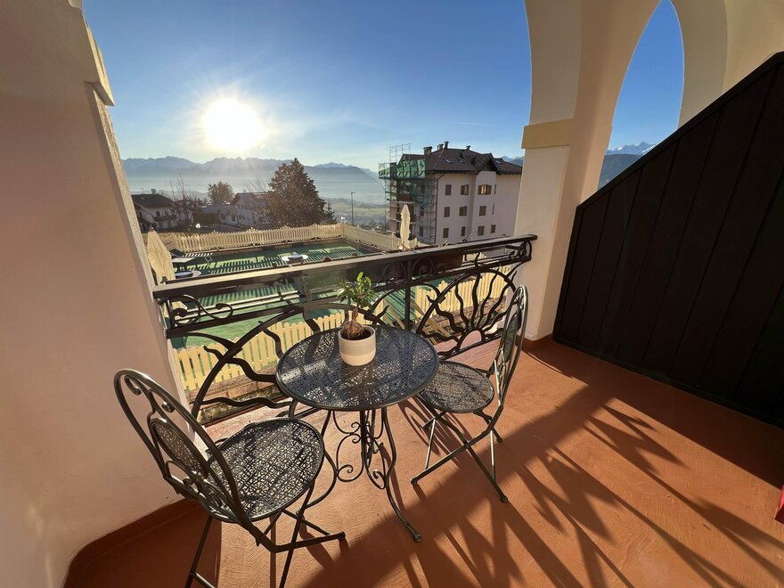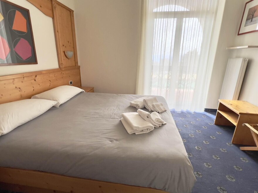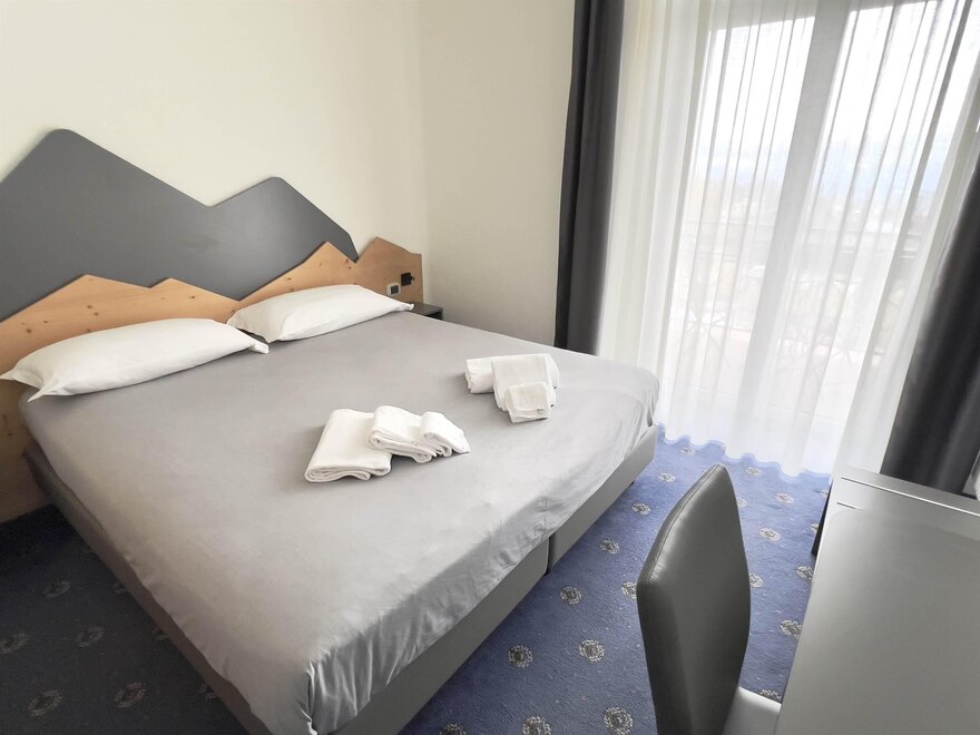 Deluxe double room, a cozy and bright space with a large balcony offering breathtaking views of the Dolomites, the majestic mountains that stand in the distance. The room is tastefully furnished in alpine style, with warm wooden tones on the walls and carpeted floors. On the balcony, there is a small table with two chairs where you can relax, enjoying the fresh mountain air and the spectacular scenery while savoring a good aperitif. Inside, the room features a comfortable double bed with soft white linens, perfect for a restorative rest. Next to it, there is a desk for reading or working in peace. A modern television is mounted on the wall, while a safe is available for storing valuables. The room is the ideal retreat for those seeking an experience of relaxation and wellness, with a touch of elegance and a view that takes your breath away.