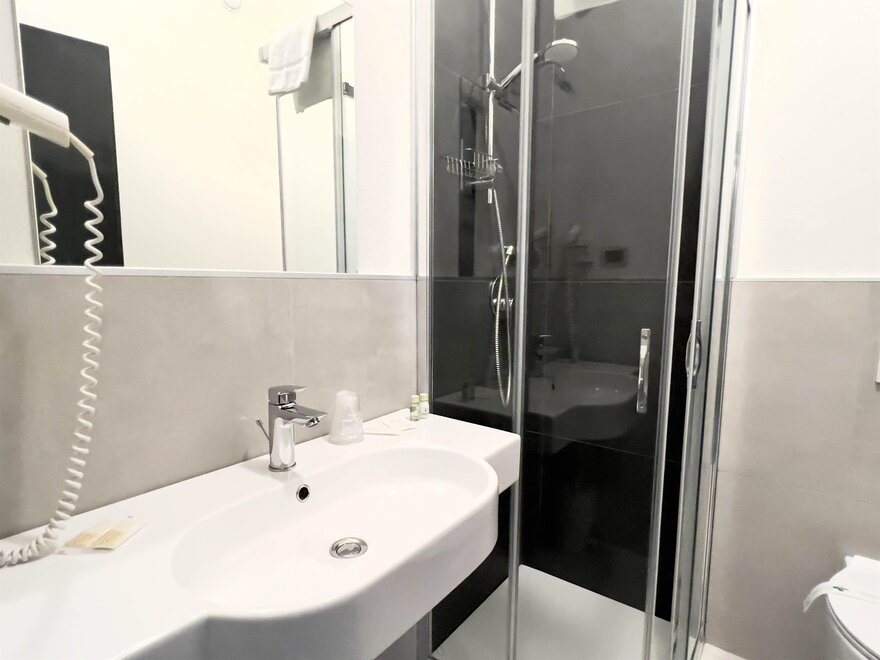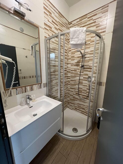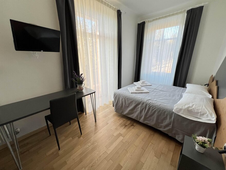 The triple rooms (qty 6) 22 sq. m. offer a comfortable and functional environment, ideal for accommodating up to 3 people. Each room is equipped with a double bed and a single bed, as well as a desk, TV, and fridge to meet every need during the stay. The rooms on the second floor boast a private external balcony, complete with a table and chairs, where guests can relax outdoors. All rooms feature a private bathroom with a window overlooking the outside, and a courtesy kit complete with towels and linens, to ensure maximum comfort and well-being.
