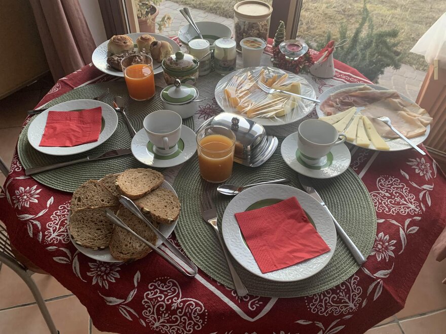 Guests can enjoy a rich breakfast with local products while taking in the view of the surrounding mountains.