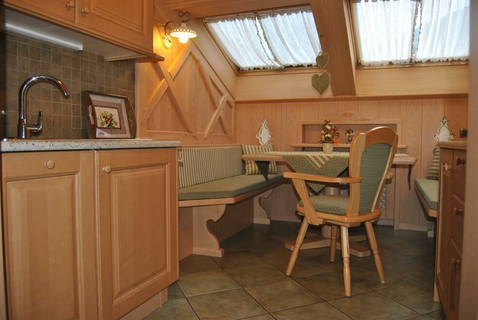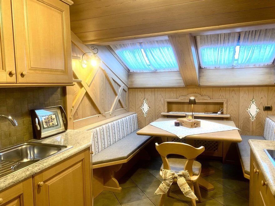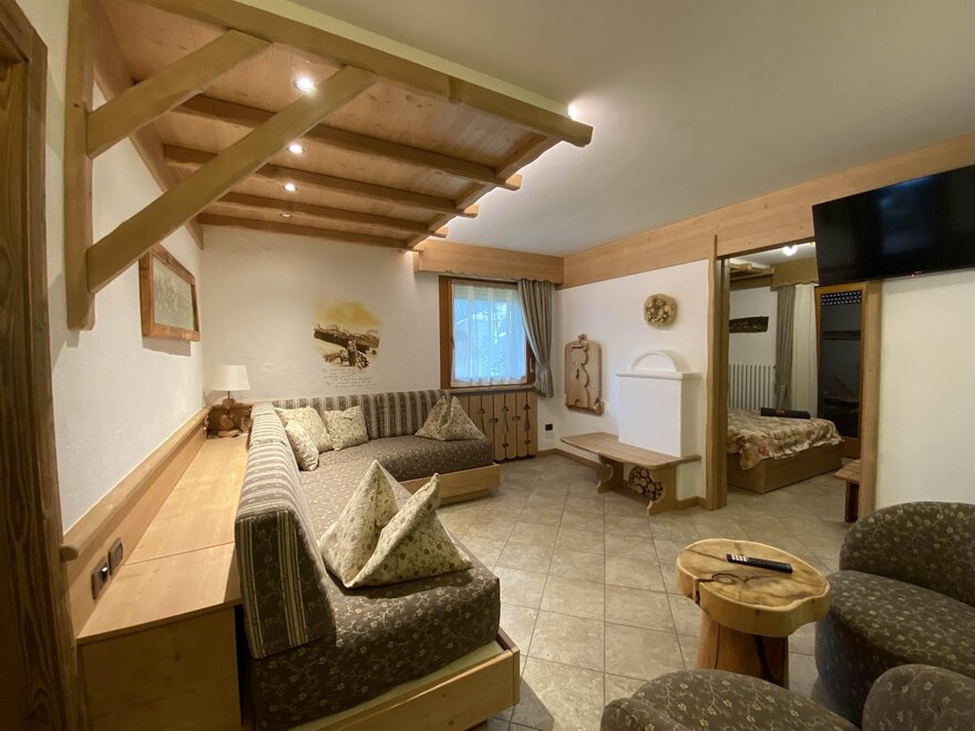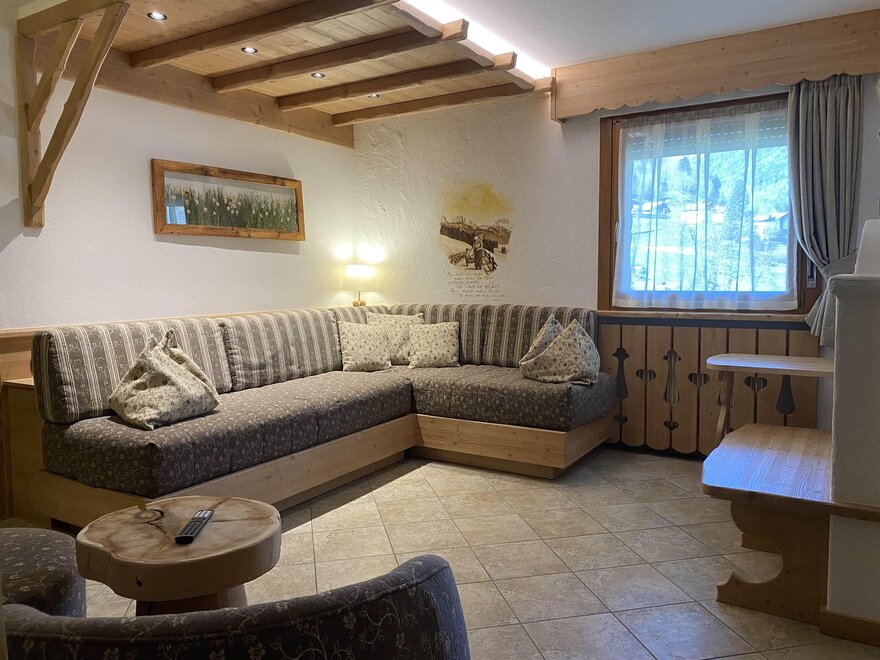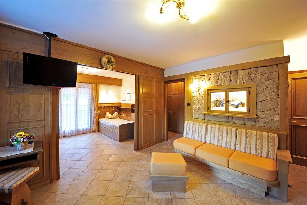 Apartment furnished with all comforts: a fully equipped kitchen with oven, microwave, crockery and cosy dinner corner, and a large balcony with deckchairs, wireless Internet connection, TV sat, thelepone and safe. Our guests can access the ground-floor, where swimming-pool, sauna, infrared sauna, games-room and laundry-ironing room are provided. At their disposal is also a welcoming lounge with garden view. For each apartment is available one car park in our garage, where are also provided a ski boot drier and some mountain-bikes for the summer excursions of guests.
