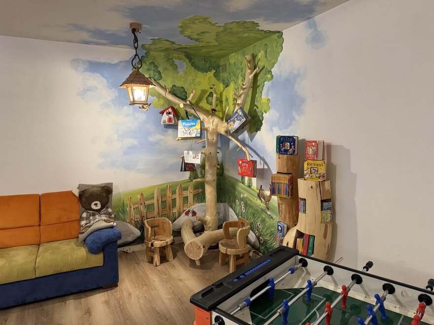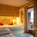 Our guests can access in the SPA, where big jacuzzi, steam bath, sauna, infrared sauna and cozy relax area. Games-room and laundry-ironing room are provided. Bedlinen and SPA set available for rent. At their disposal is also a welcoming lounge with garden view. For each apartment is available one car park in our garage, where are also provided a ski boot drier and some mountain-bikes for your summer excursions.