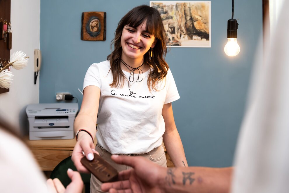 These cozy rustic apartments are equipped with a bedroom featuring a wardrobe and a safe to securely store your personal belongings. The bathroom includes a toilet, shower and bidet, while the kitchen is equipped with an induction cooker, dishes, a coffee maker and a refrigerator with a small freezer. You can relax in front of the flat-screen TV with Sky access and enjoy breakfast on the terrace or in the private garden while admiring a breathtaking view.