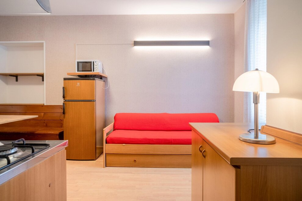 The two-room apartment features a living room with a two-seater sofa bed, a kitchenette with four gas burners and a microwave, and a double bedroom with a third bed. Spacious bathrooms with shower or bathtub.