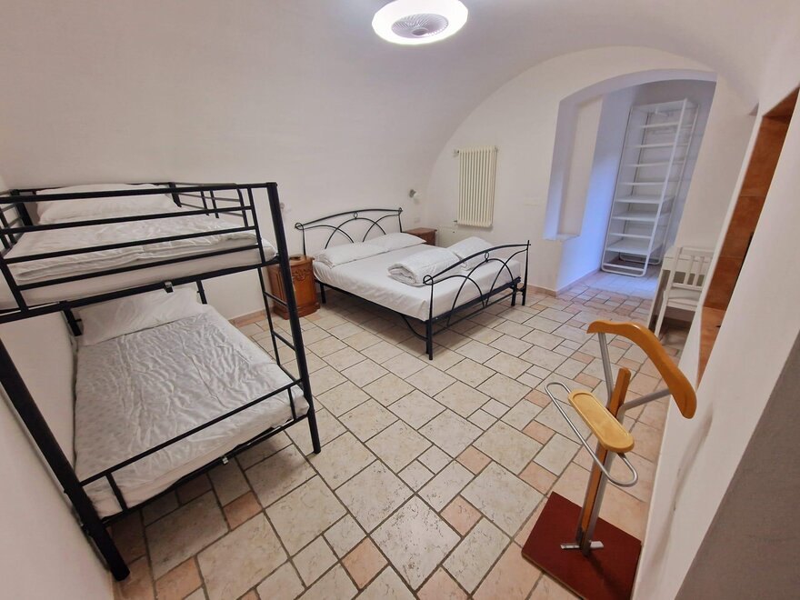 Quadruple room with double bed and bunk beds. Large ensuite bathroom with bathtub and shower.