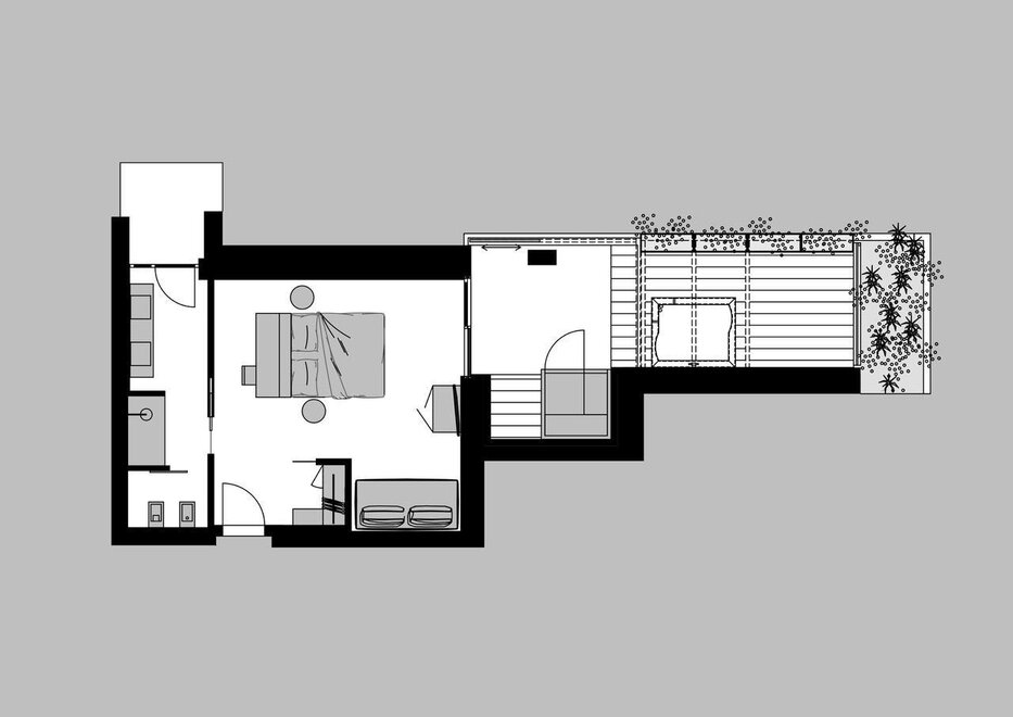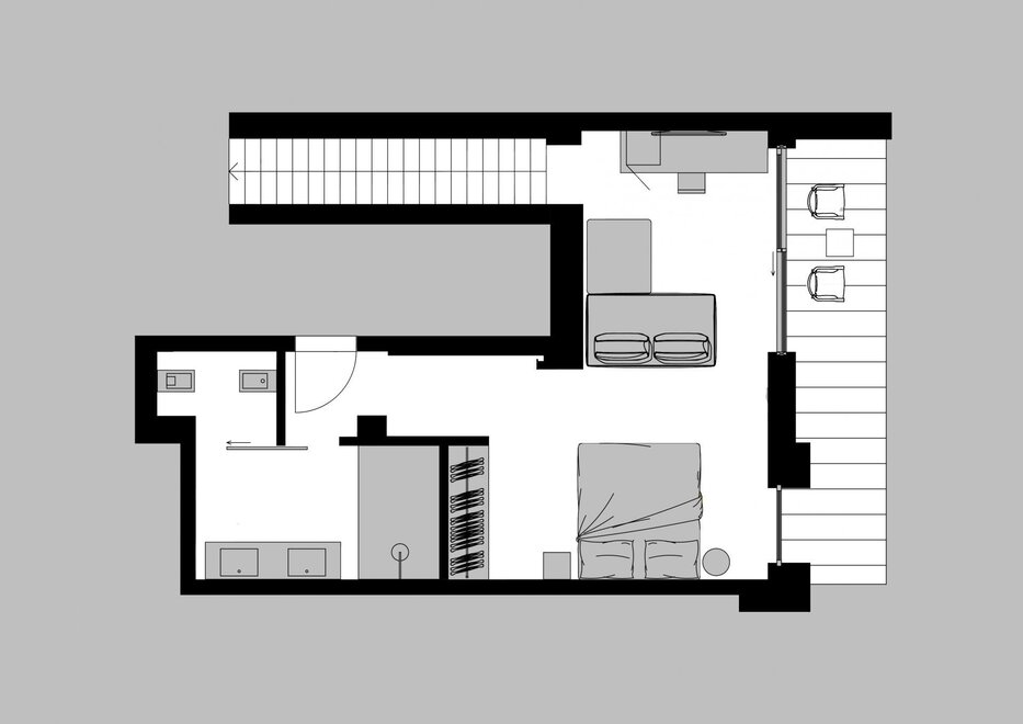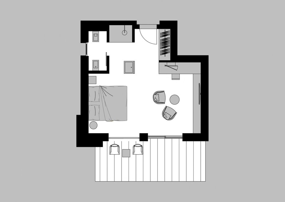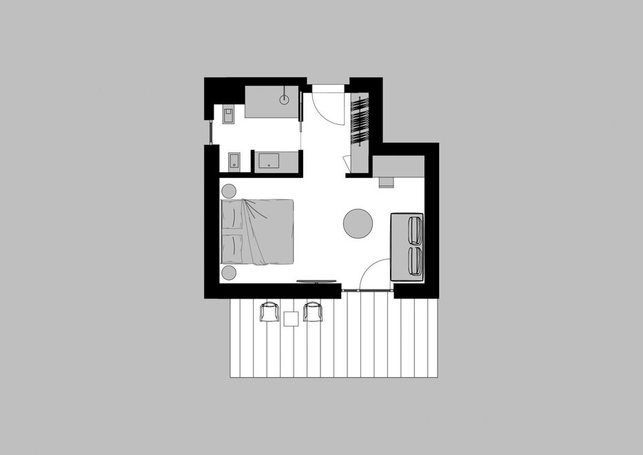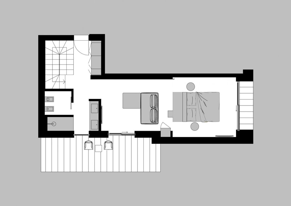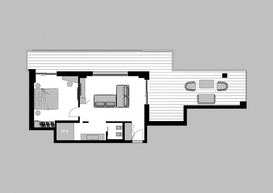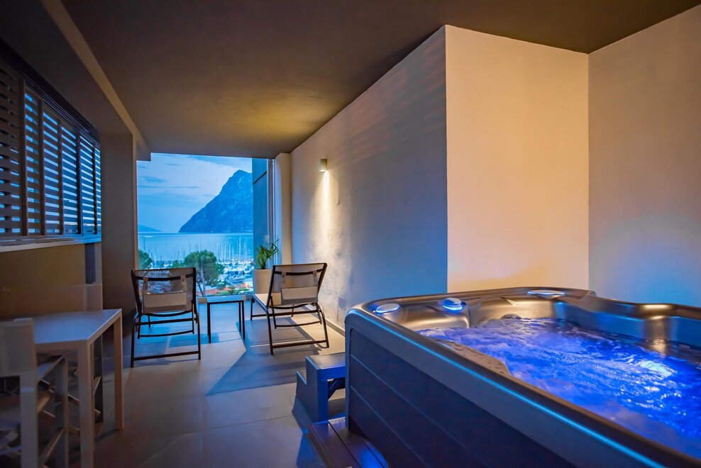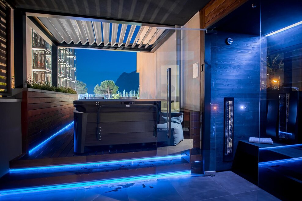 It is located on the fifth floor and it has a separate living room and bedroom, an open shower with steam bath, and a huge (over 50 sqm) terrace with hot tub and balcony with exercise bike. Here you can enjoy the view of the mountains and the lake in total privacy and relax.Highlights: