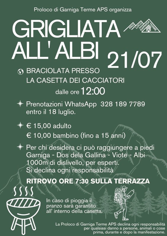 On Sunday, July 21, 2024, starting and meeting from the "terrace" of Garniga Terme, you will reach "Malga Albi" for a barbecue in company. Those who wish can reach us on foot: Garniga - Dos dela Gallina - Viote - Albi (1000 meters of altitude difference, for experts). All liability is disclaimed.