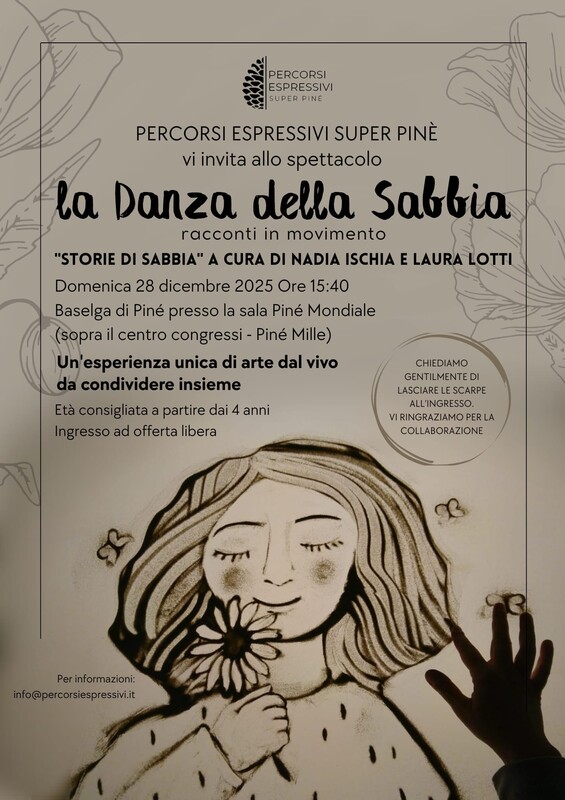 Percorsi Espressivi Super Piné presenta "La danza della sabbia", un'occasione unica di venire in contatto con l'arte che prende forma attraverso il movimento: un movimento che fa parte di tutti noi, che ci esprime e ci caratterizza. Non mancare a questo magico appuntamento sotto le feste di Natale.
