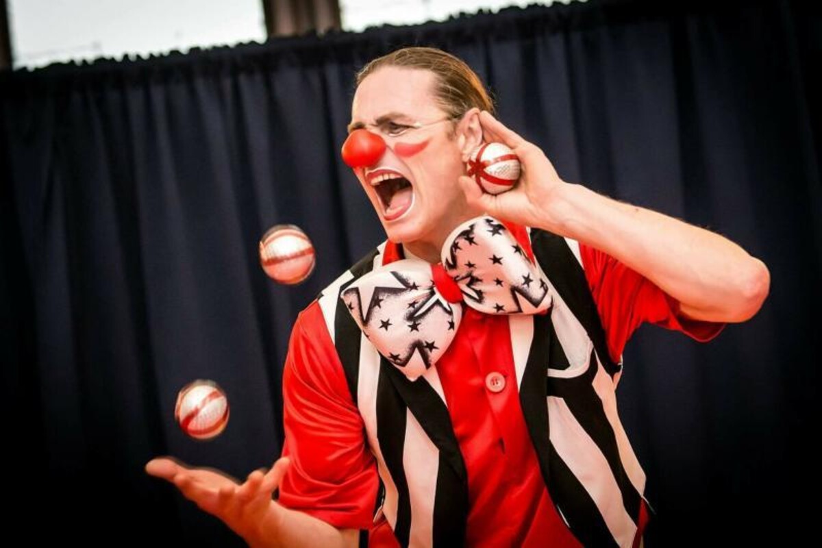The performance, entirely set to a cheerful and rhythmic musical backdrop, amazes and excites the audience with a series of incredible 'circus-like' skills. The show, an exhilarating mix of juggling, acrobatics and balancing acts, is articulated on a constant increase in technical difficulty, without neglecting the comedy and gags typical of clowning. The continually increasing rhythm of the show, from juggling with balls, clubs and hoops to elements of balancing on rola - bola and verticalism, turns the artist's 'physical' performance into a 'magnet' capable of holding the attention of any audience from start to finish.