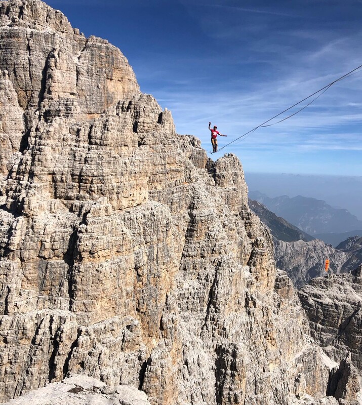 As part of the Circen Dolomites Festival, high performance tightrope walking exhibition at the foot of the Catinaccio by slackliner and professional highliner Andrea Agostini