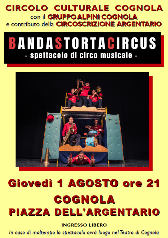 The Circolo Culturale Cognola, together with the Gruppo Alpini Cognola and with the contribution of the Circoscrizione Argentario organise a musical circus show on Thursday 1 August 2024 in Piazza dell 'Argentario.