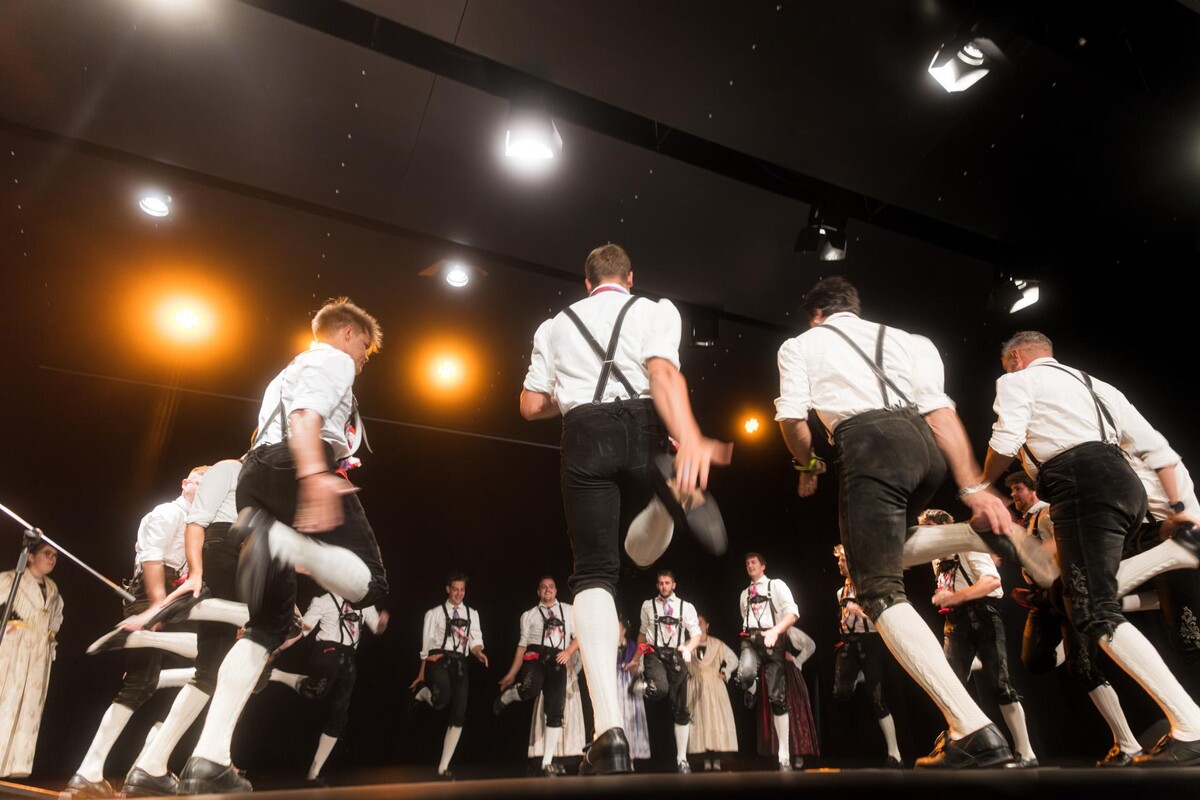 Folk performance of the dance group Schuhplattler from Campitello