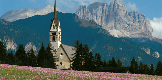 Close your eyes for a moment and picture a little village in the Dolomites with large wooden haylofts and a little church whose slender bell tower has a pointed top, with green meadows and towering mountains all around. Located at the foot of the Rosengarten (Catinaccio) group and Latemar, Vigo di Fassa is like something out of a fairy tale.