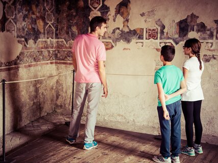 An eye-catching landscape between the lower Palace and the Fortress ruins, surrounded by century-old cypress trees. Inside, you can visit the Prigione del Sasso dungeon, the Torre Grande and the splendid cycle of secular frescoes from the 14th century depicting ladies intent on playing chess.