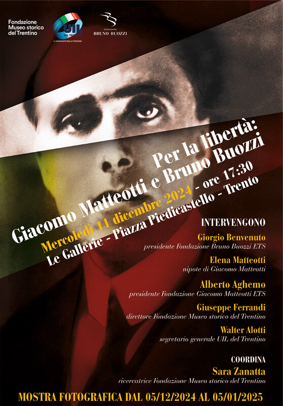 The one on 11 December at Le Gallerie is a joint initiative of the Fondazione Museo storico del Trentino, Fondazione Bruno Buozzi and Uil del Trentino to remember the two figures who, 20 years later, lost their lives in defence of their ideals and in the name of freedom. If in fact on June 10, 1924 the socialist deputy Giacomo Matteotti was kidnapped and then murdered by a group of squads for denouncing violence and illegality of the nascent Mussolini dictatorship, on June 4, 1944 Bruno Buozzi, historic union leader and Matteotti's party comrade, was shot by the Nazis along with thirteen other people in the last massacre of the capital, known as the "massacre of La Storta".