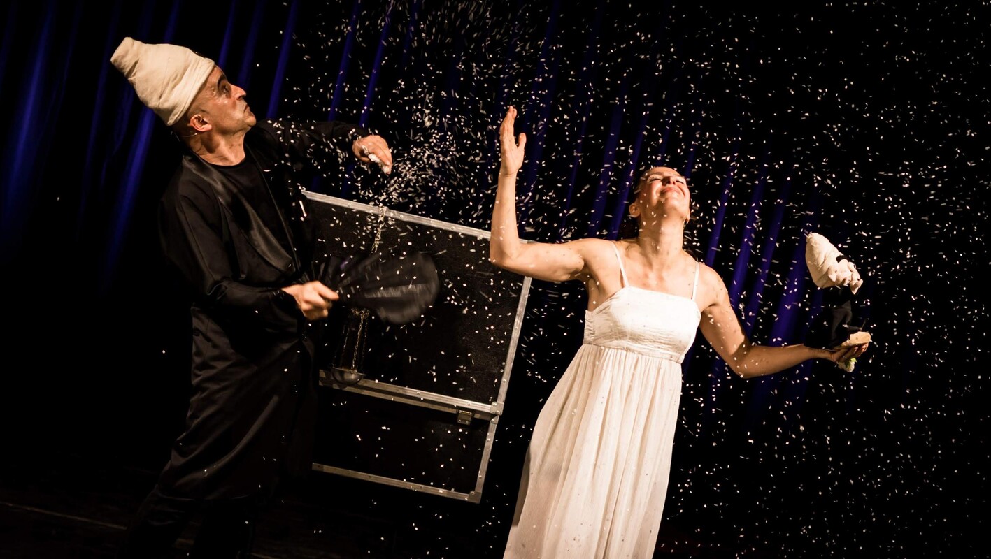 A pyrotechnic crescendo of comedy, magic, acrobatics, poetry and madness. An art show somewhere between circus-theatre and cabaret. The Lannutti & Corbo company - i.e. the Italian Domenico Lannutti and the Argentinean Gaby Corbo, both on the square since 1995 - give life to a surreal-popular variety show, animated by bizarre and absurd characters: a barker, a soubrette, Saverio the object of desire, an acrobat who wants to live in an upside-down world, a mute ventriloquist, Frank-Stein, the Maiella magician and his assistant. The show can be enjoyed from 0 to 100 years of age, and can be enjoyed at any time of day or night, before and after meals.