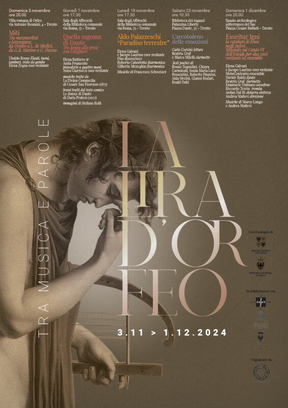 The Music and Poetry Festival "La lira d 'Orfeo", organized by our Cultural Association "Fabbrica del pensiero", in collaboration with the Superintendence of Archaeological Heritage of Trentino and the Municipal Library of Trento and with the support of the Trentino Alto-Adige Region and the Autonomous Province of Trento, will start from Sunday, November 3 until Sunday, December 1, 2024.
