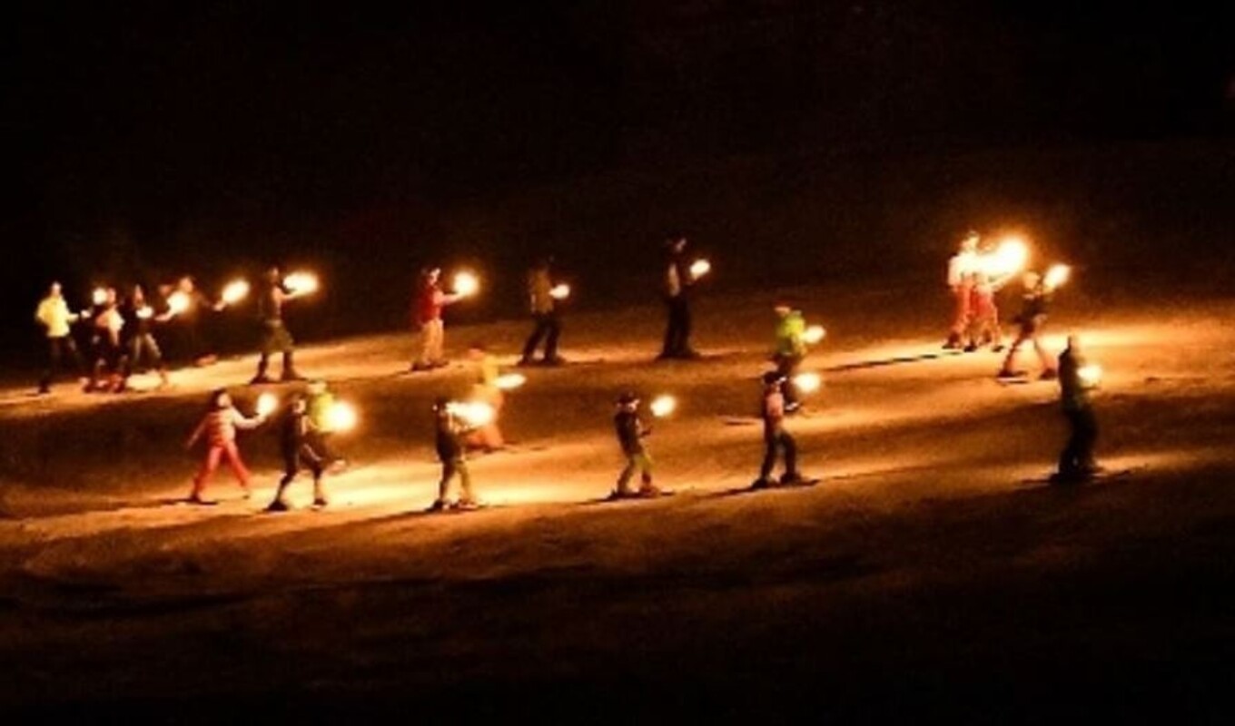 As dusk falls, the whitewashed slope sparkles with excitement. A fun torchlight ski hike is about to start.