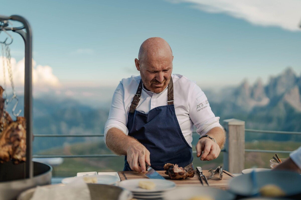 A haven of taste where Michelin-starred cuisine blends with the simplicity of the highlands, with walls of light and views of the Dolomites. In December 2023, Michelin-starred chef Alfio Ghezzi found his second home in Val di Fassa with the InAlto restaurant, at 2,500 metres. Here, he has taken up the challenge of cooking at high altitude, making the most of the ingredients that have always nourished the mountain people - or rather, those who truly inhabit the highlands. A balanced cuisine, in harmony with the landscape, which enters the refuge at any time of day thanks to the large windows that define its architecture. Immersed in the view of the south face of the Marmolada, Pelmo, Civetta and Pale di San Martino, you can enjoy a break of pleasure and well-being that combines taste, scenery and silence in the highest heart of the Val di Fassa...