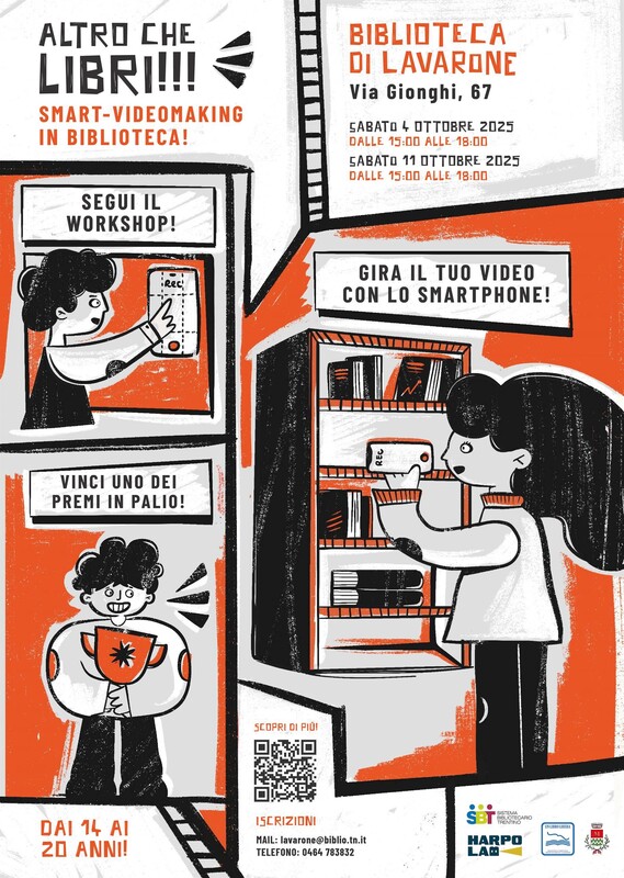 Forget about books!!! Smart videomaking in the Library. Location: Library of Folgaria, via Battisti 28. Dates: August 21 and August 28, 2025. Time: August 21 from 14:30 to 18:30. August 28 from 14:30 to 16:30. Age: from 14 to 20 years old. REGISTRATION: email folgaria@biblio.tn.it; phone 0464721673.