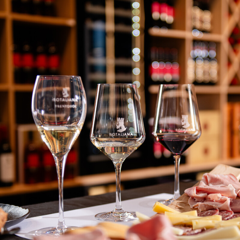 The experience will conclude at our Rotaliana Wine Shop with a tasting of three glasses of 40 ml each of R Extra Brut, Müller Thurgau, and Teroldego Rotaliano Superiore Riserva, along with a small food entrée.