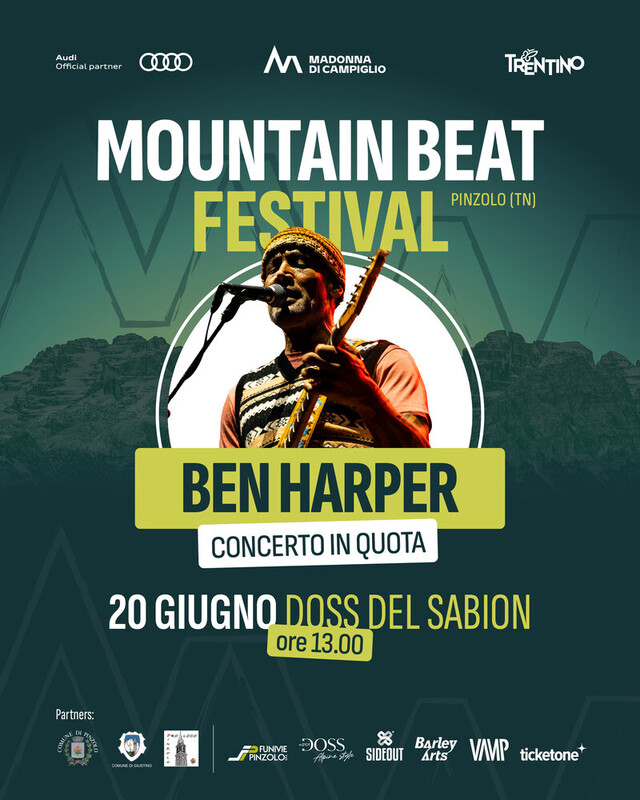 A stage suspended between sky and mountains: at over 2,100 meters on Doss del Sabion, in the Brenta Dolomites, Ben Harper brings his music to high altitude.