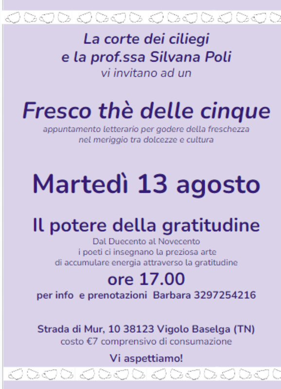 Tuesday, August 13, 2024 at "La Corte dei Ciliegi" together with "Silvana Poli" invite you to a "Fresco tea at five o'clock", a literary event to enjoy the freshness in the afternoon between sweets and culture.