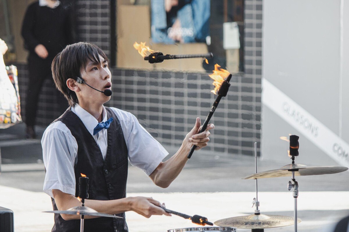 An overwhelming show that combines circus techniques and rhythm with surprising harmony: this is "The Juggling Drummer". The sticks fly through the air, performing spectacular tricks without ever breaking the beat, while the audience is drawn into an interactive game of beats and smiles. Gaku is a Japanese artist and musician who has combined his two passions since childhood. After training in Australia, he made his debut in Sydney as a street artist and has performed all over the world. Today, he is a certified "Heaven Artist" of the city of Tokyo.