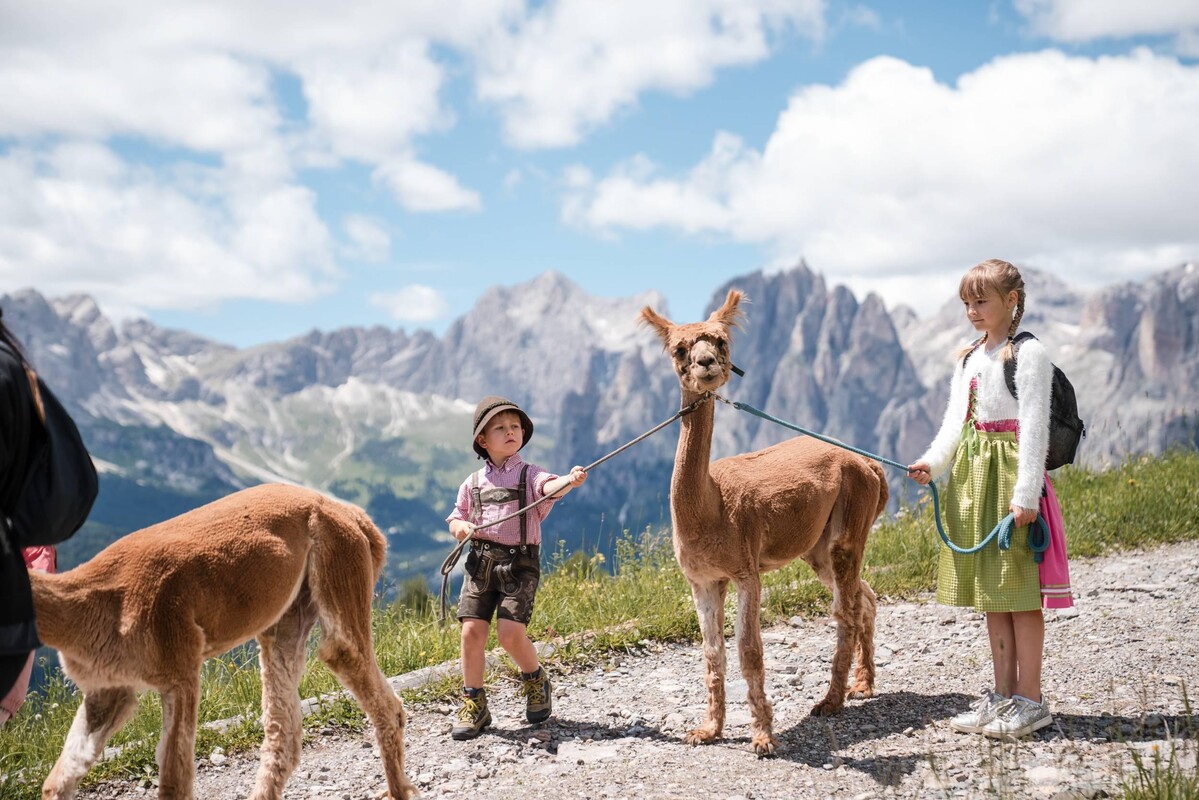 A slow-paced trek, guided by the calm and steady gait of alpacas, perfect companions for a walk through the Buffaure pastures. The excursion allows you to come into direct contact with these docile and fascinating animals: participants will take turns accompanying Picasso, Manolo and their other four-legged friends with a halter and lead rope, getting to know them step by step. The group will be accompanied by a mountain guide, who will enrich the experience with stories and interesting facts about this enchanting and peaceful corner of Val di Fassa.