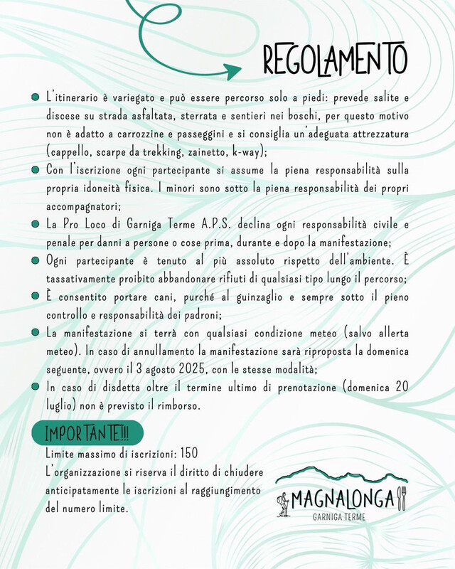 Dopo qualche anno di pausa, la Pro Loco di Garniga Terme A.P.S., con il supporto del Comune e delle associazioni locali (Vigili del Fuoco, Alpini, Cacciatori e Centro Anziani), è lieta di annunciare il ritorno della Magnalonga, in programma per domenica 27 luglio 2025.