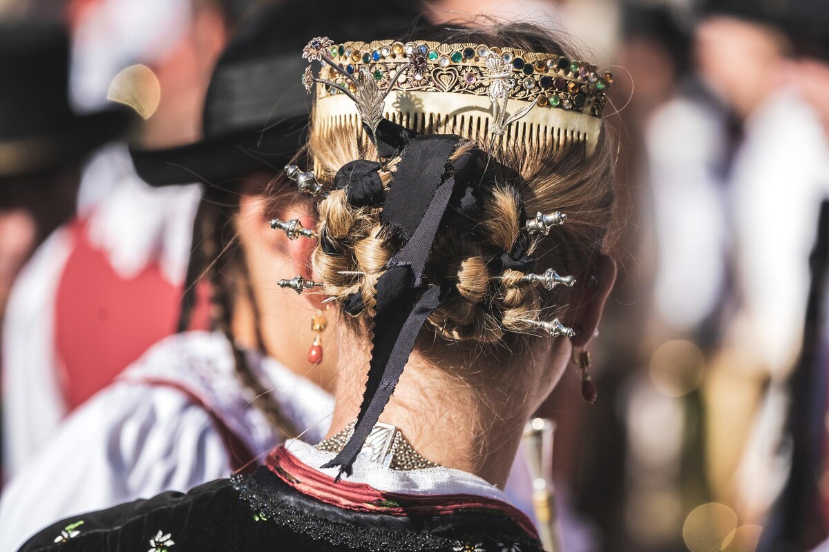 The folk group "Uniun Bal Popolar Val Badia" performs typical choreographies of the Ladin and South Tyrolean traditions, accompanied by the cheerful notes of the accordion