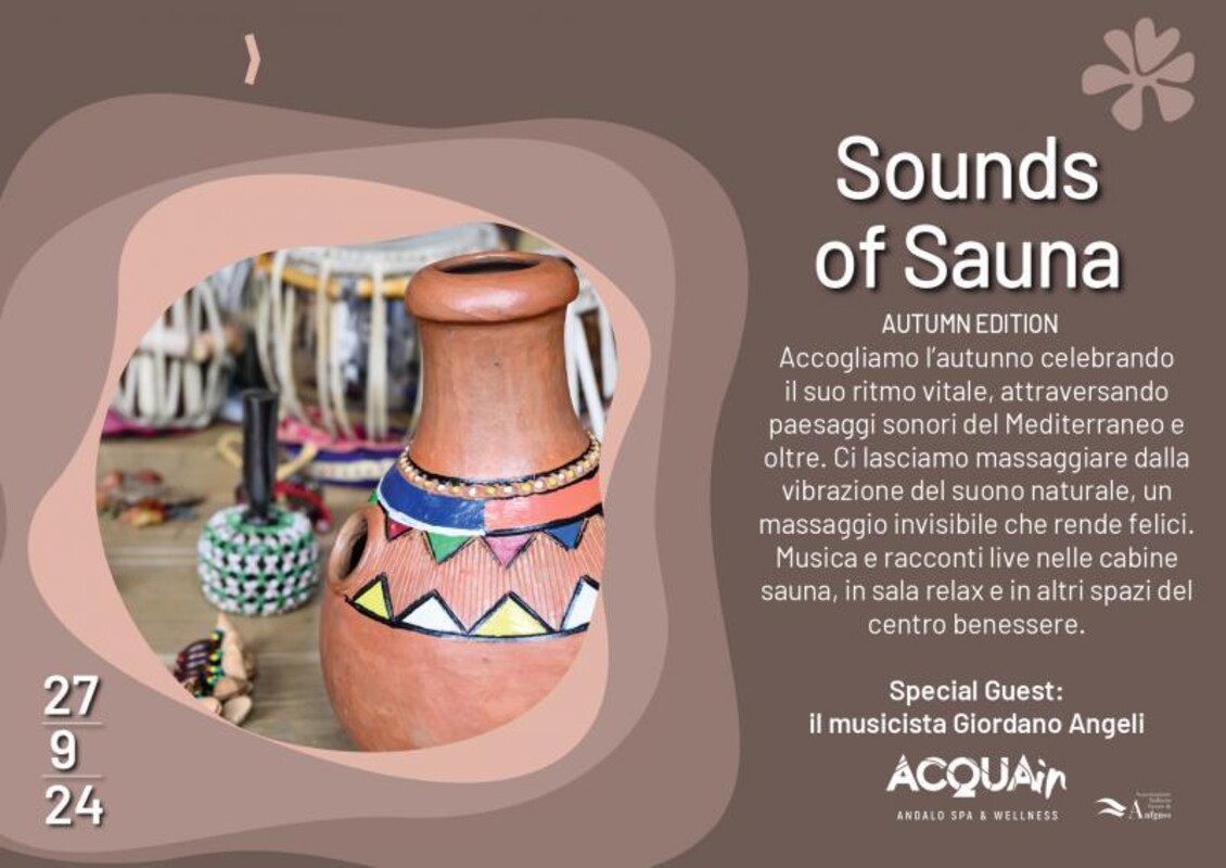 Accogliamo l’autunno celebrando il suo ritmo vitale, attraversando paesaggi sonori del Mediterraneo e oltre. Ci lasciamo massaggiare dalla vibrazione del suono naturale, un massaggio invisibile che rende felici. Musica e racconti live nelle cabine sauna, in sala relax e in altri spazi del centro benessere.