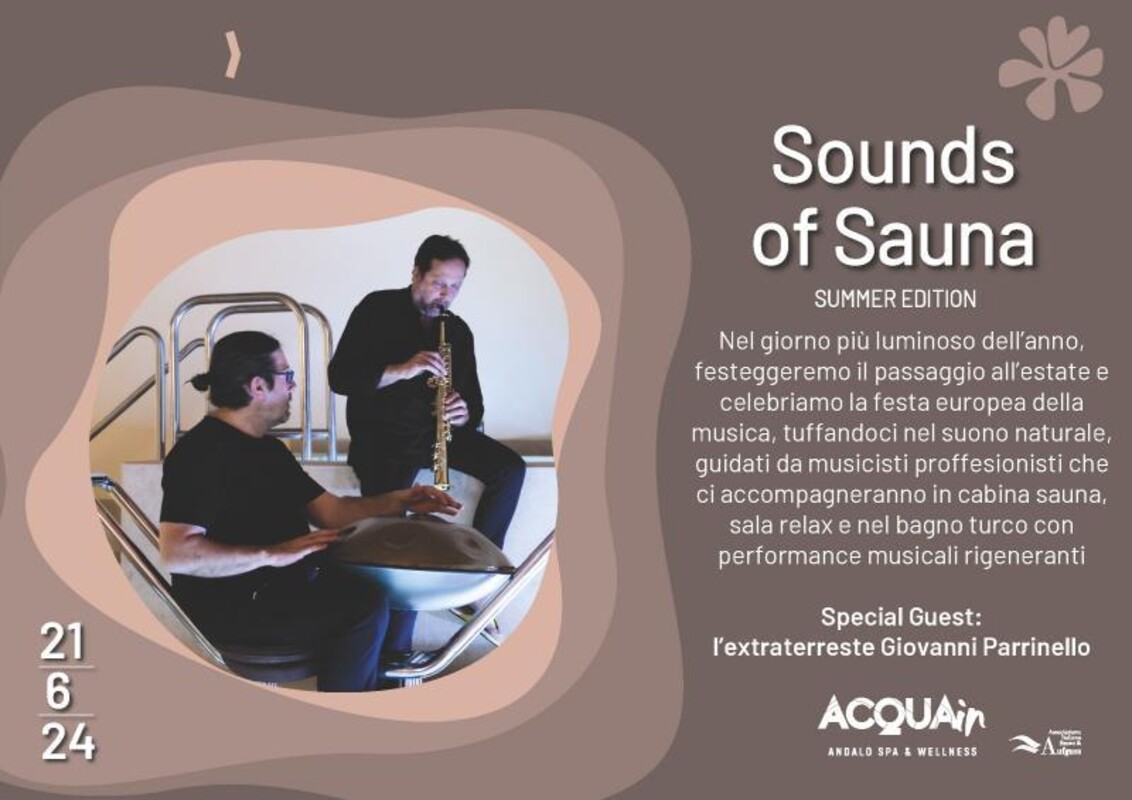 Friday 21th June 2024 from 2 pm the doors of the ACQUAin wellness center, in Andalo in the heart of the Andalo life, open for an afternoon of relaxation and live music Sounds of Sauna - Summer edition.