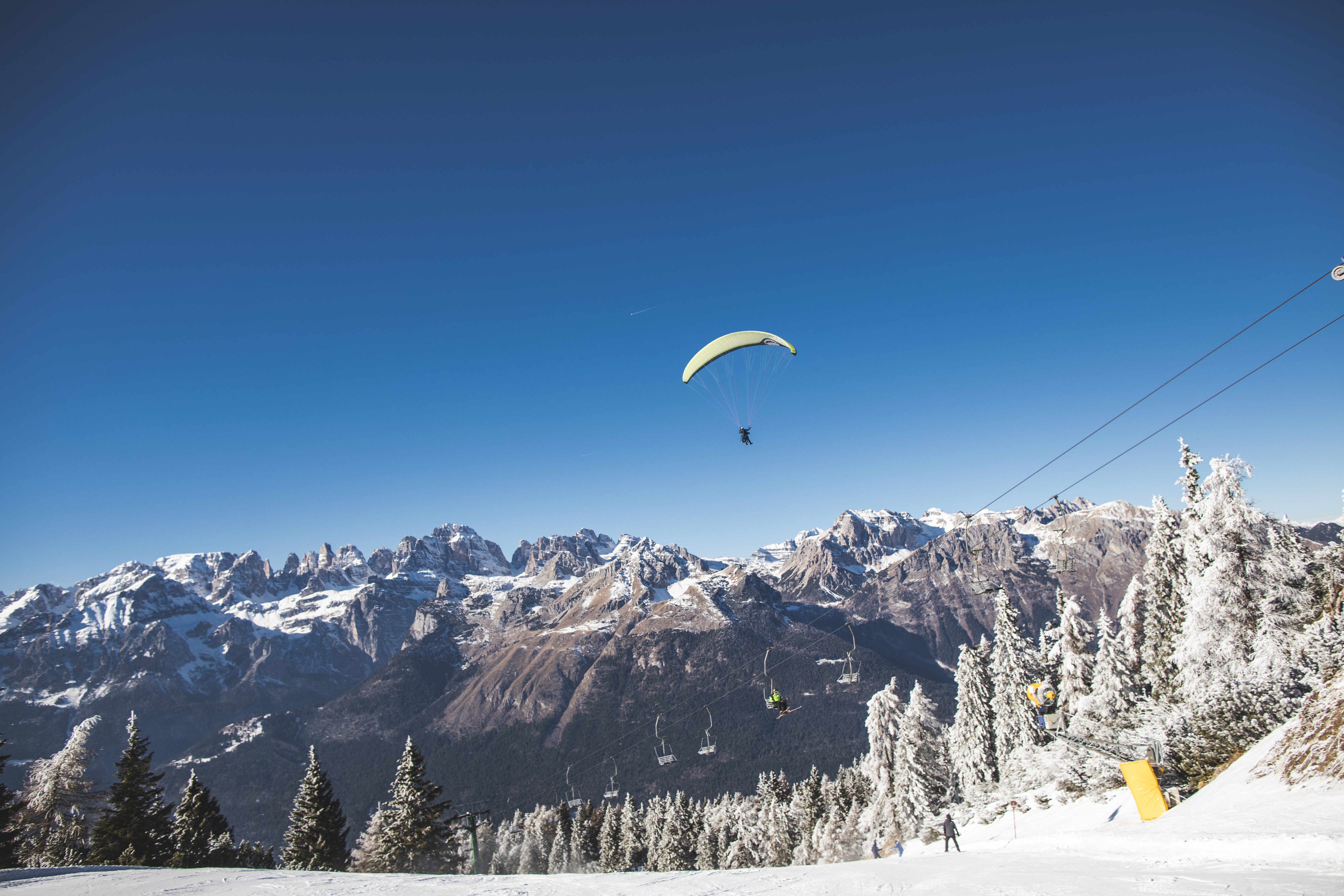 In San Martino di Castrozza you can end the day on the slopes by paragliding down to the valley, also on skis, taking off at sunset from Punta Ces, or Cima Tognola or Cima Rosetta and flying over the ski area.