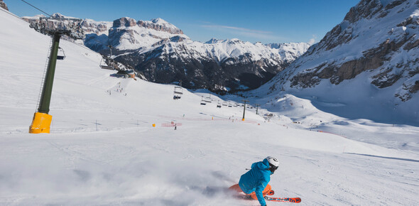 Skiing in the Val di Fassa in winter means being surrounded by rock faces that take on a pink or reddish hue at dusk as you lose yourself in the splendour of the beauty and harmony of the landscape.