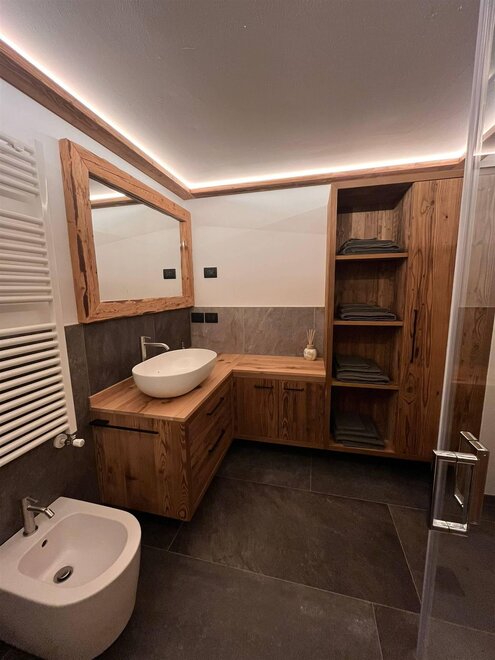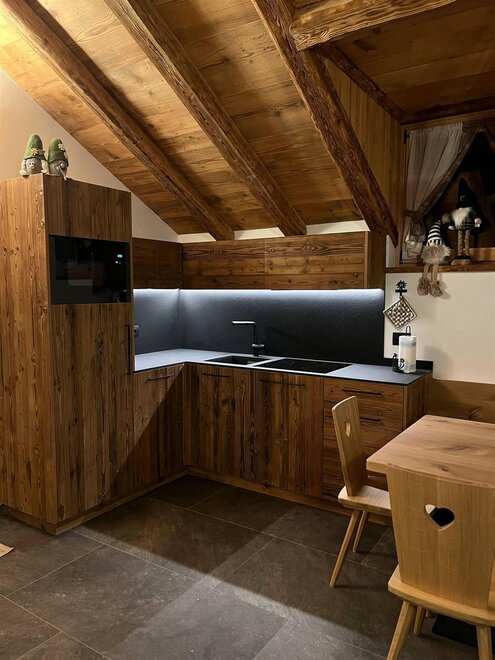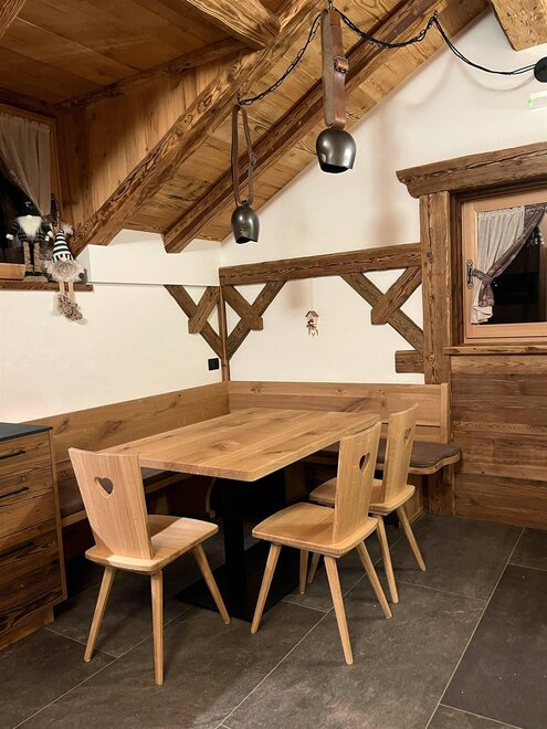 Una scala in legno di larice vi porterà al piano superiore dove troverete un'area open space con cucina completamente attrezzata, (forno a microonde- piano ad induzione con le pentole adatte) Lavastoviglie frigo - piccolo freezer. Piatti e stoviglie Mini pimer Moka Tovagliette per la colazione e tovaglia un tavolo di legno di rovere con giro panca e sedie e un comodo divano. L’intera baita è riscaldata con un sistema di riscaldamento a pavimento. La baita non è raggiungibile con la propria auto.