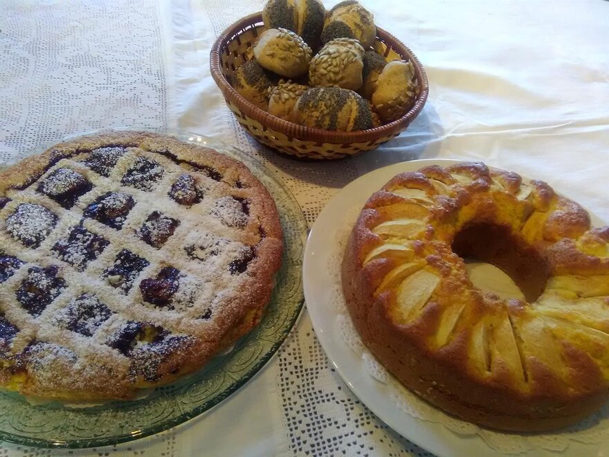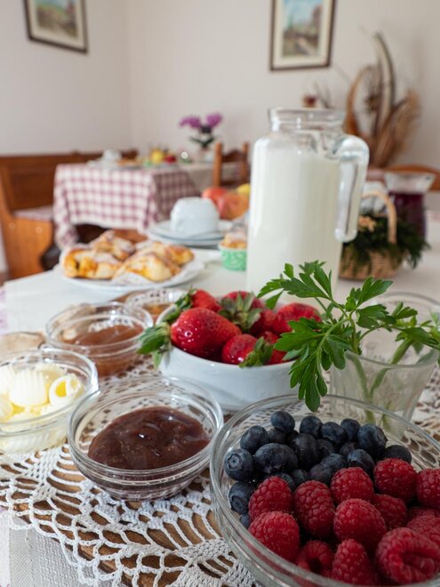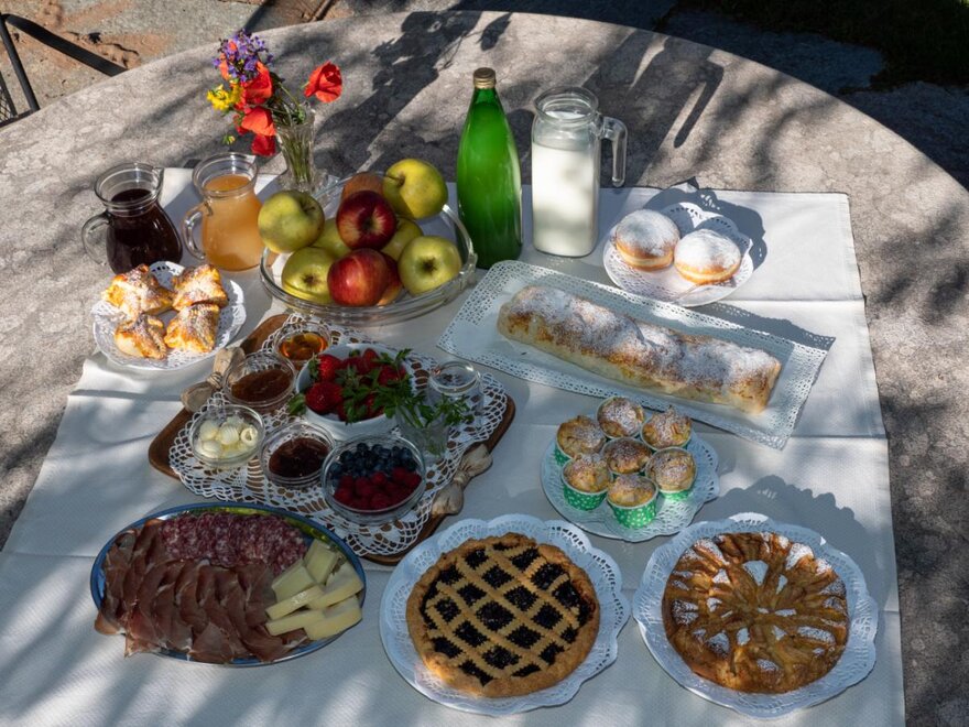 Le colazioni, servite in una sala luminosa e accogliente, sono realizzate quasi esclusivamente con prodotti tipici e naturali ricavati dal lavoro svolto all'interno dell'azienda agricola di famiglia,quali marmellate,mieli,affettati,yogurt,dolci,succhi di mela,lamponi,ciliegie,more.