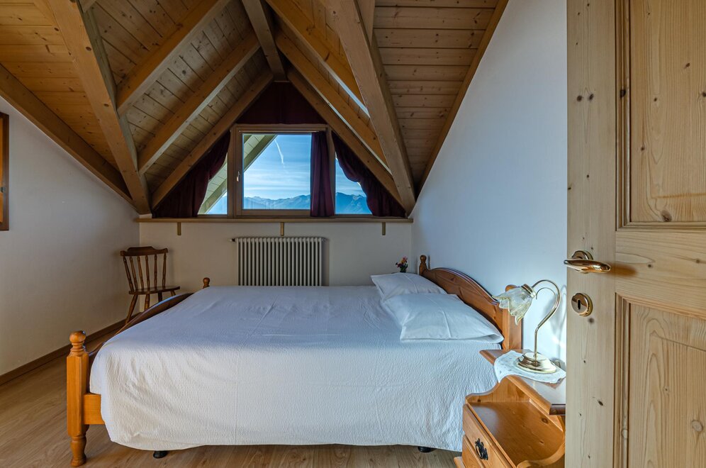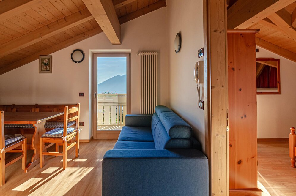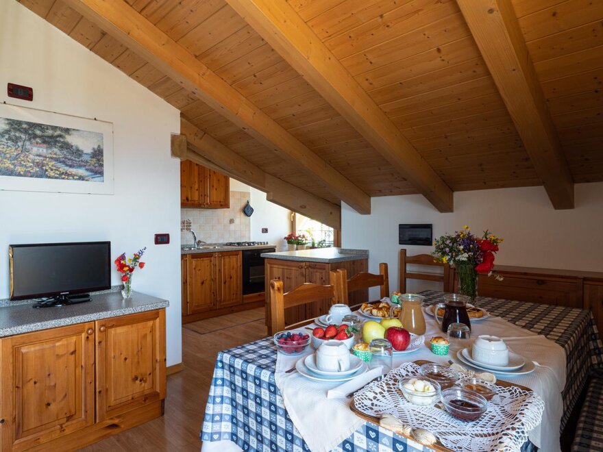 Appartamento di 50 mq. mansardato, nuovo e con arredamento in stile montano composto da una grande camera da letto matrimoniale e a richiesta + 2 letti singoli, ampia zona giorno con cucina - soggiorno attrezzata, comodo divano letto singolo, bagno con doccia e lavatrice. L'appartamento è completo di stoviglie,frigorifero e televisione. Grande giardino. Ascensore.