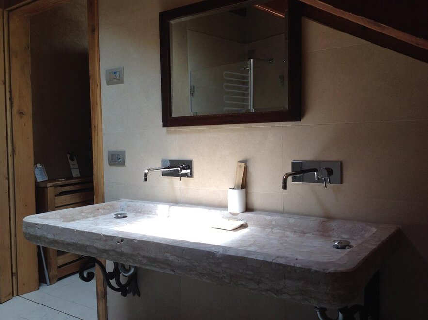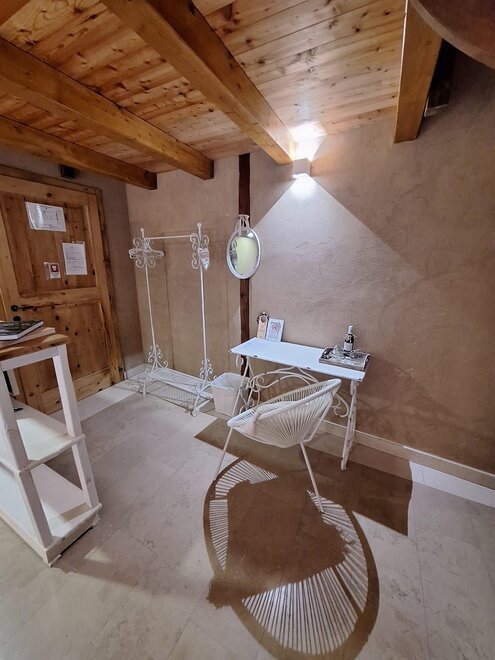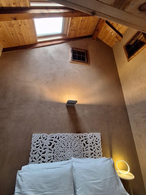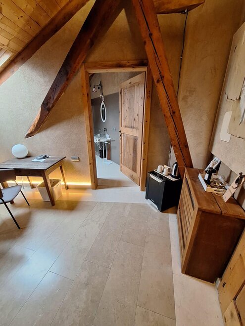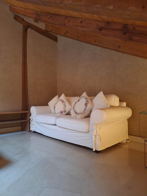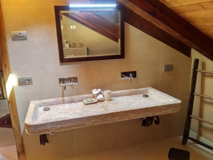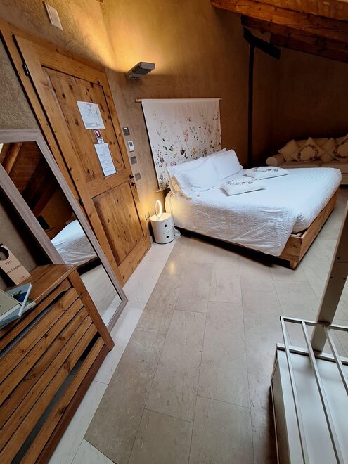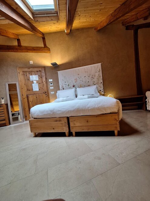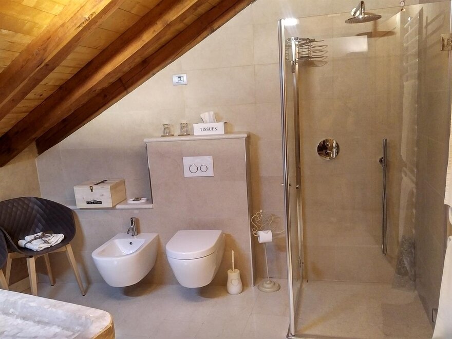 La camera Marzemino è perfetta per due persone ma anche per tre, ha un bellissimo e comodo divano a letto. Ci son due suggestive finestre nel tetto e il bagno, anch'esso una finestra nel tetto, ha il lavandino in pietra che si trovava anticamente nel maso che ospita l'agriturismo. Marzemino è il nome del vino tipico della nostra valle, la Vallagarina. Le pareti sono tutte costruite con l'argilla. troiverete la radio in camera ed in bgano, l'aria condizionata, WiFi, biscotti del benvenuto e mobili fatti a mano con il legno del vecchio maso.