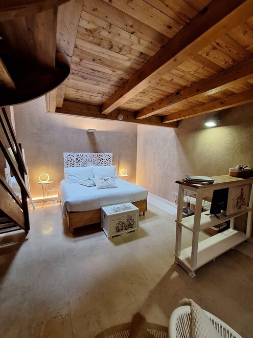 La camera è ideale per due persone, oltre alle finestre nel tetto sia in camera che in bagno, ha un seggestivo abbaino vicino al letto.