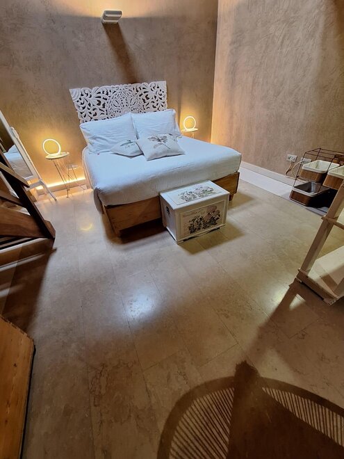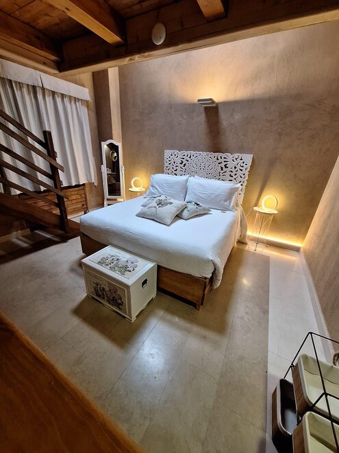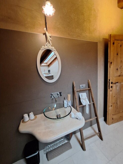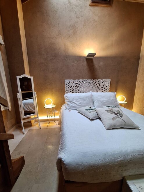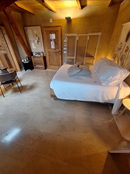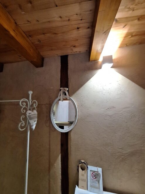 Le pareti sono tutte costruite con l'argilla. troiverete la radio in camera ed in bgano, l'aria condizionata, WiFi, biscotti del benvenuto e mobili fatti a mano con il legno del vecchio maso.