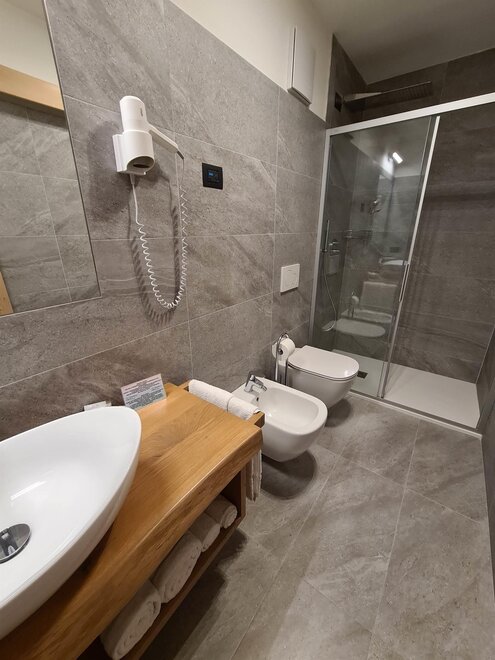 Camere con vista panoramica e/o balcone. Arredate su misura in tipico stile montano offrono un soggiorno confortevole. Servizi privati di nuova ristrutturazione con box doccia ed asciugacapelli. Dispongono di televisione a schermo piatto, Sky, telefono, scrivania e cassaforte. Pavimento in parquet. Su richiesta possibilità di letti separati.
