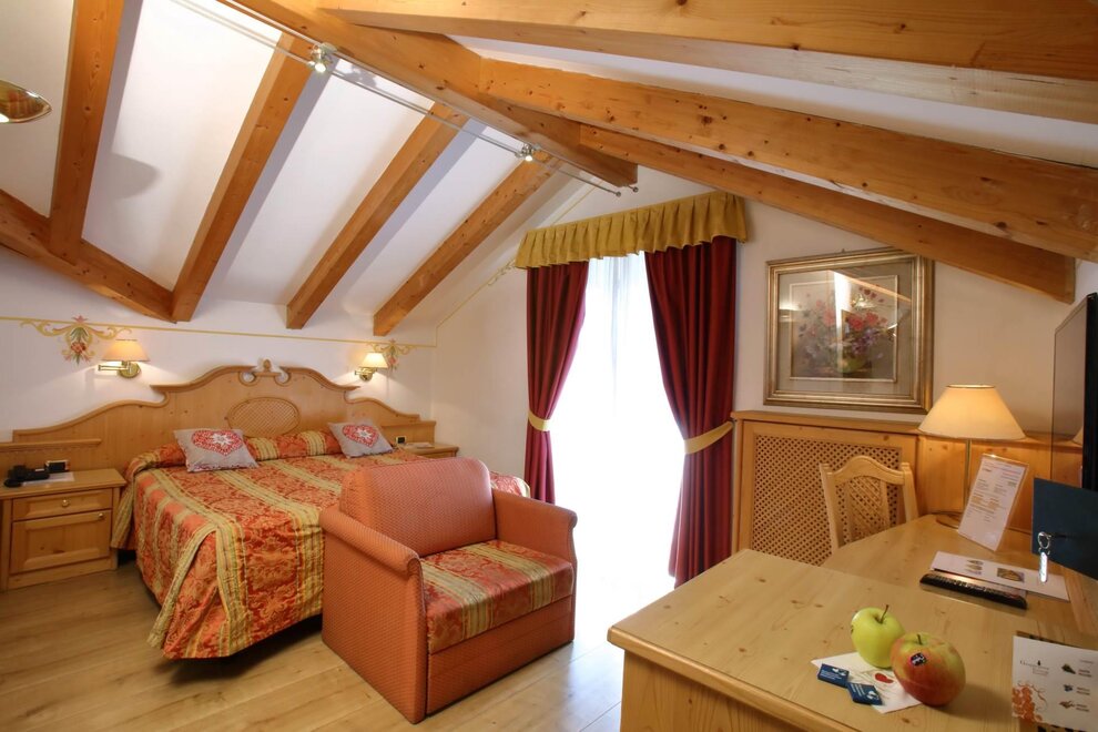 Stanza matrimoniale o a 2 letti con salottino separato da porta scorrevole dotato di divano letto più eventuale quarto letto, con servizi con doccia o vasca, phon, minifrigo, cassaforte, tutte con balconcino, tv lcd con 6 canali SKY, telefono.