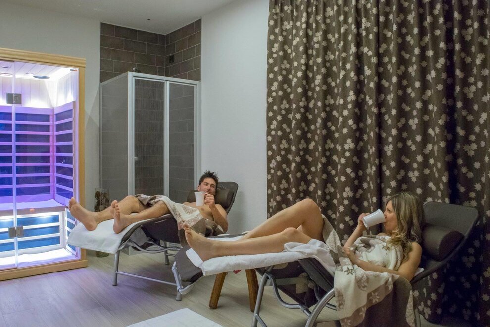 SPA "Le Maddalene". La piscina con acqua salina riscaldata a 32° C e un’oasi delle saune con sauna finlandese, sauna a infrarossi, biosauna e bagno turco. Ampia Zona Relax interna ed esterna.